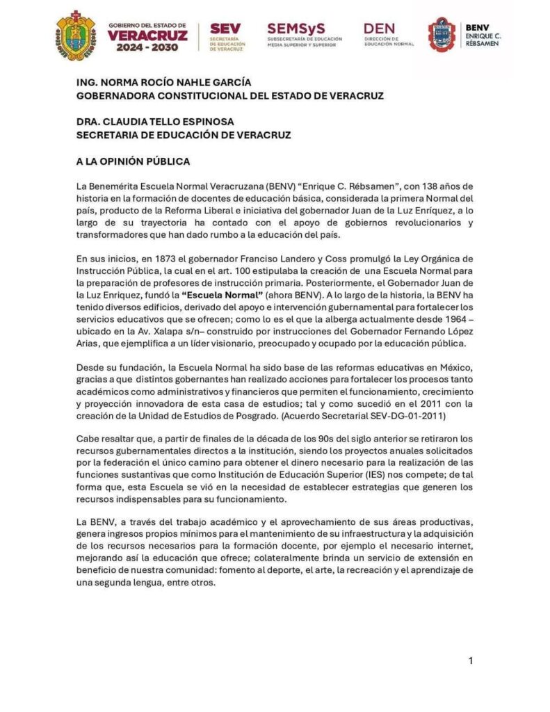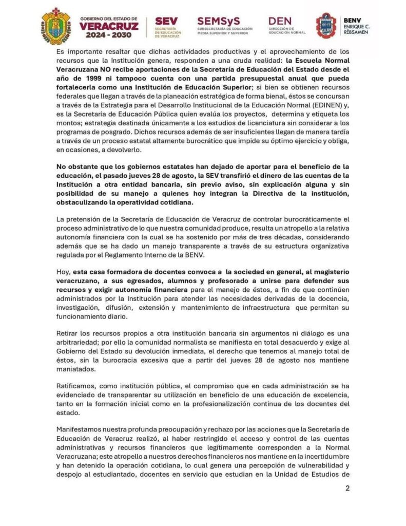 En un pronunciamiento dirigido a la gobernadora Rocío Nahle García, a la titular de la SEV, Claudia Tello Espinoza, y a la sociedad en general, la institución reprochó que la medida obstaculiza su operatividad cotidiana y vulnera la autonomía administrativa que ha mantenido durante más de tres décadas.