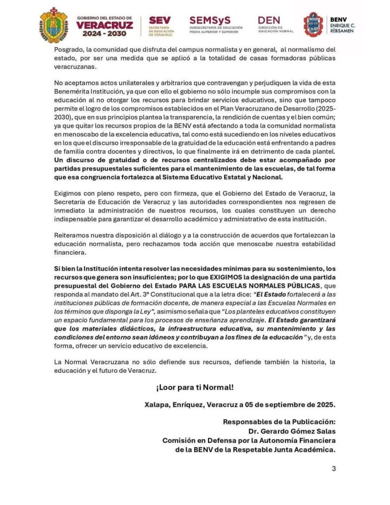 La Normal convocó a su comunidad, egresados, magisterio veracruzano y sociedad civil a unirse para defender la autonomía financiera y exigir el respeto al manejo de los recursos que, recalcaron, siempre se han administrado con transparencia.