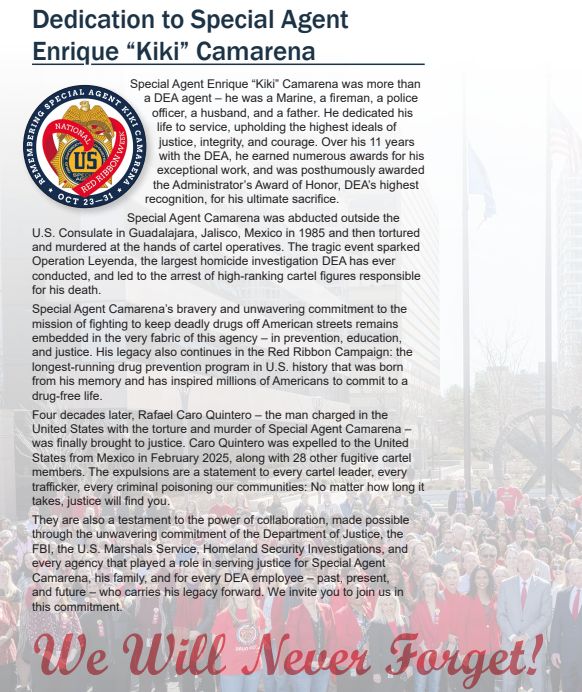 “El agente especial Enrique “Kiki” Camarena fue más que un agente de la DEA: fue infante de marina, bombero, policía, esposo y padre. Dedicó su vida al servicio, defendiendo los más altos ideales de justicia, integridad y valentía. Durante sus 11 años en la DEA, recibió numerosos premios por su excepcional labor y recibió póstumamente el Premio de Honor del Administrador”.