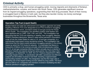 Y advierte: «Varias agencias federales y estatales de aplicación de la ley y reguladoras están investigando conjuntamente a una organización delictiva transnacional involucrada en el contrabando de metanfetamina, heroína y petróleo y gas del mercado negro a través de la frontera entre Texas y México».